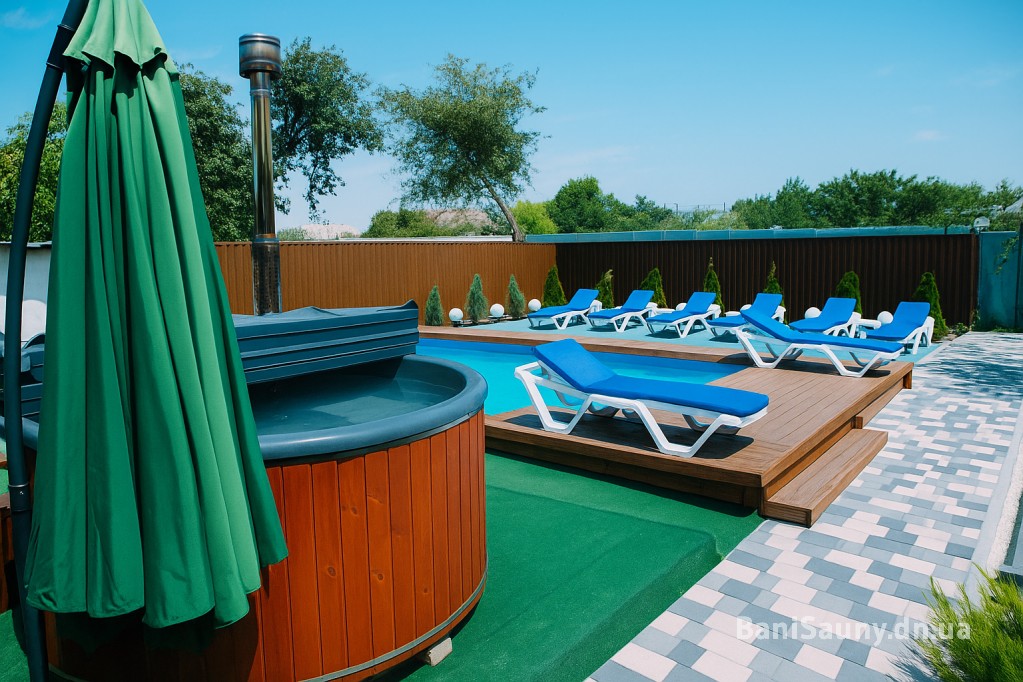 Басейн, чан і зона відпочинку На відкритій території комплексу розташований літній басейн, великий чан на дровах з гідромасажем і затишна тераса з шезлонгами. Тут можна чергувати гарячі процедури з прохолодним зануренням у басейн, засмагати або просто розслабитися на відкритому повітрі. Лаунж-зона, зелень навколо і повна конфіденційність роблять цю локацію ідеальною для відпочинку за містом біля Дніпра.